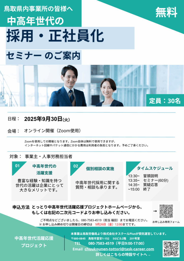 本事業は鳥取労働局より株式会社タスクールPlusが受託・運営を行っております。